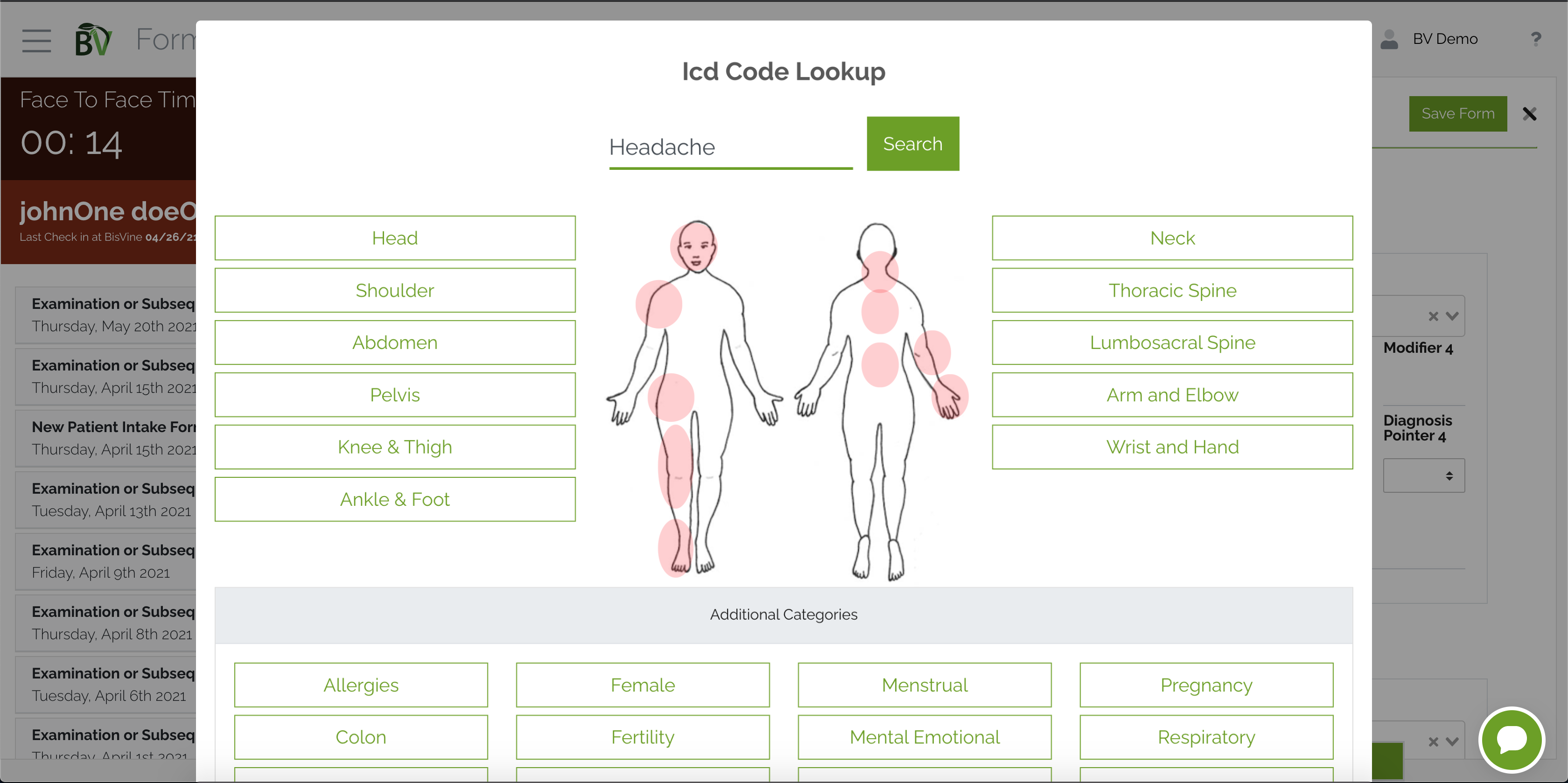 Search for all ICD10 codes based off body part or diagnosis. Quickly add to your diagnosis exam forms for easy submission for insurance claims. All ICD-10 codes are the latest and will notify you if they are being changed.